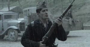 A principios de febrero de 2004, mi hijo Tatán, antes de regresar a su refugio de Valdespina, en Soria, una noche me dejó el encargo de devolver al video club una copia de esa película, que él había alquilado; esa noche yo me encontraba cargado de sensaciones extrañas, porque por la tarde había estado dándole mi último adiós a un com- pañero en la idea, pero en aquellos momentos tenía el alivio de que a la mañana siguiente no iba a sonar el despertador temprano, así que me desparramé sobre el sofá para volver a ver la historia del soldadi- to que le perdonó la vida a Rafael Sánchez Mazas, cuando la guerra ya estaba en su proceso final. Contemplé la peli con sosiego y con el mando a distancia para mí solito, para poder rebobinar los detalles y las frases que merecieran un repaso oportuno.
